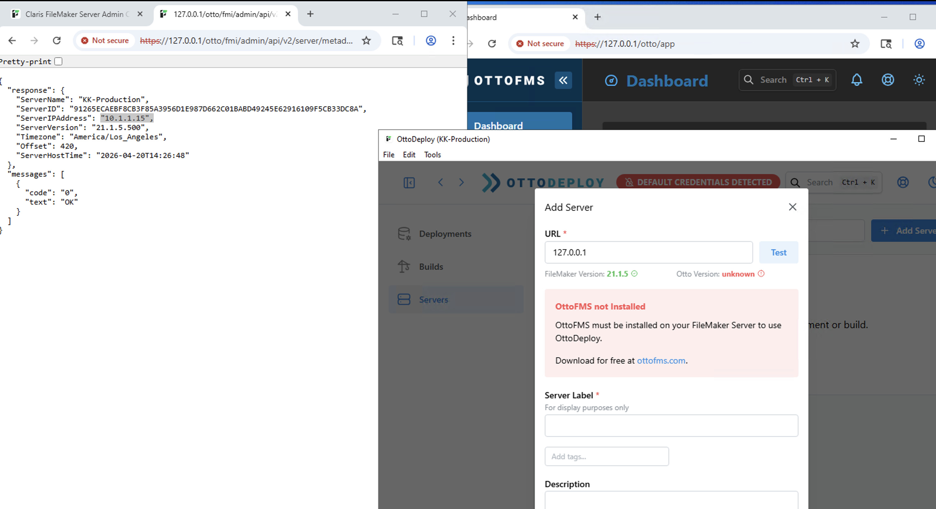 We’ve got a client server that has OttoFMS running on it, and we can access that perfectly fine. But when trying to add that server in Otto Deploy, we get an error where the OttoFMS version comes back as unknown. We’ve tried using OttoDeploy locally and on a couple of other servers, using both local IPs and public (no DNS available – they hide most things behind VPNs. Is that part of the issue?). Ports 80 and 443 are open completely.